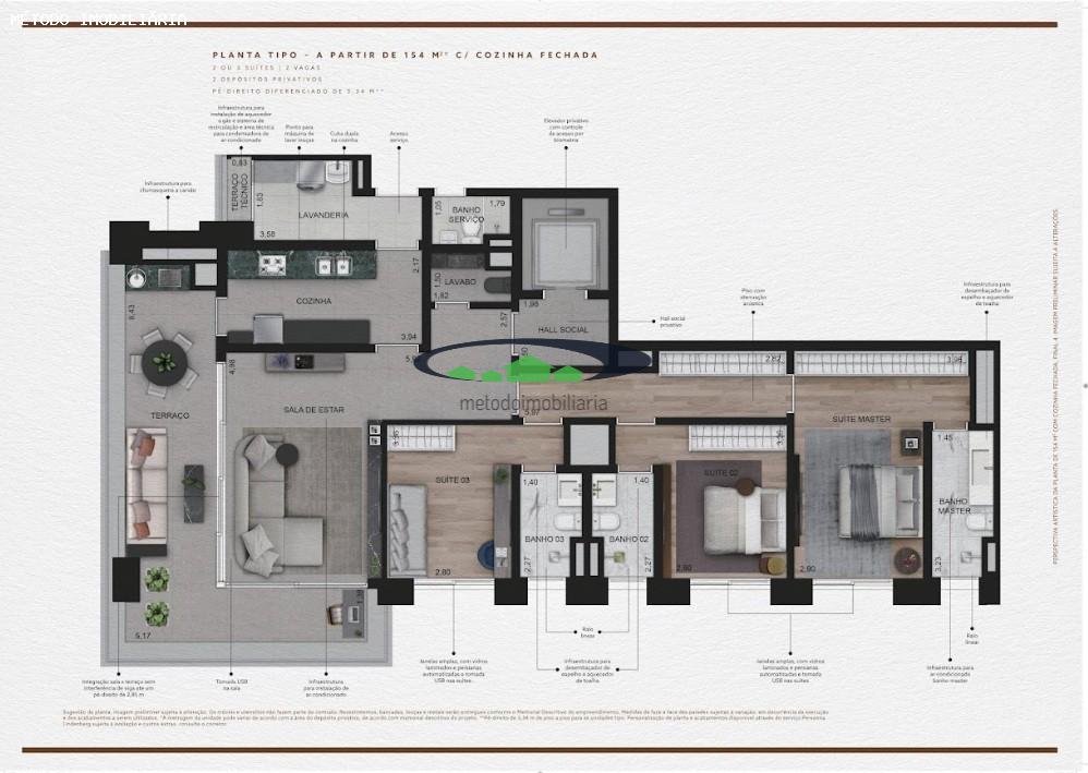 Infra para instalação de ar nas suítes, terraço, cozinha, sala e banho master.